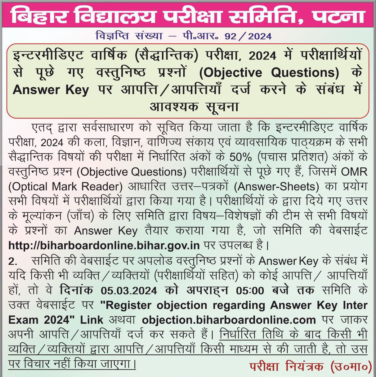 • ब्रैकिंग अपडेट : बिहार स्कूल एग्जामिनेशन बोर्ड पटना ने हाल ही में उन लोगों के लिए Answer key जारी किया है जो वर्ष 2024 में इंटर वार्षिक परीक्षा (Bihar Board 12th) में शामिल होने वाले हैं। यदि आपके Answer key में कोई त्रुटि है, तो आप इस लिंक के माध्यम से सुधार करवा सकते हैं।