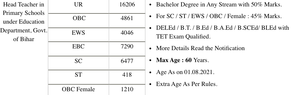 | Bihar Head Teacher Vacancy Details Total Post : 44506 | |||||||||