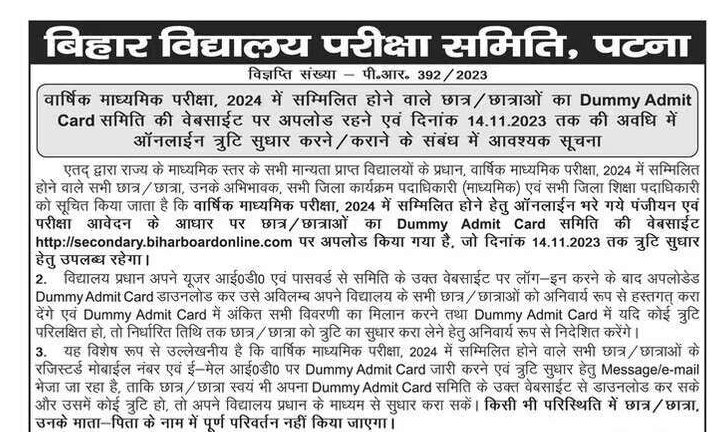 Short Information: Bihar School Examination Board (BSEB) has recently issued a notification that it issues dummy admit card for the students appearing in Matric 2024(bseb dummy admit card). If you have any error in the dummy admit card, then you can correct it by informing the Principal by 14th November 2023. Can get correction or dummy admit card is for those students who are appearing in Matriculation Annual Examination 2024