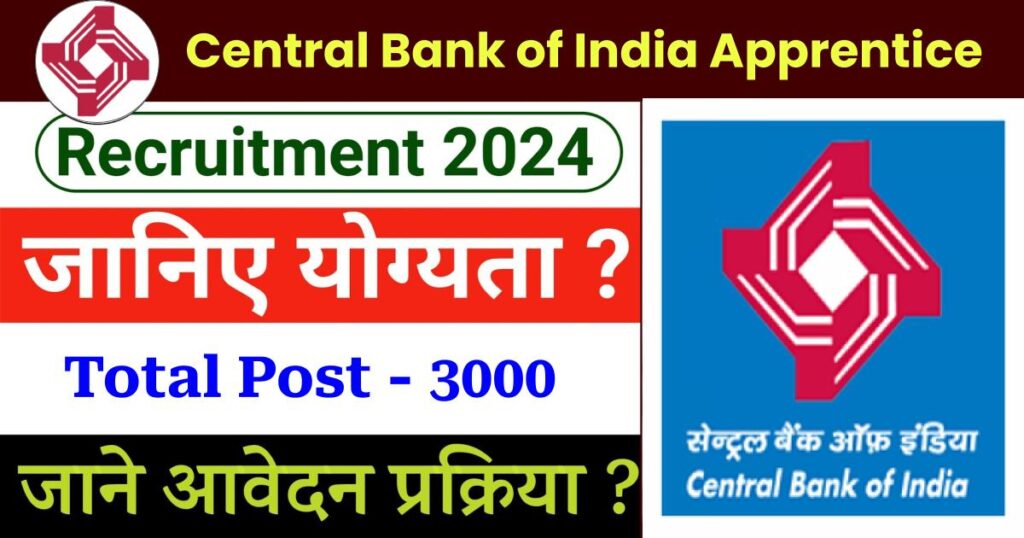 Central Bank of India के तरफ से नौकरी की तलाश कर रहे अभ्यार्थियों के लिए Apprentice के 3000 पदों पर निकली भर्ती, इस पद की भर्ती के लिए अभ्यार्थियों का चयन ऑनलाइन रिटेन टेस्ट के माध्यम से होगा।