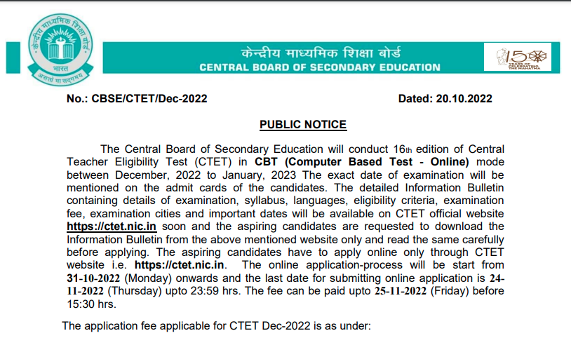 The Central Board of Secondary Education will conduct the 16th edition of the Central Teacher Eligibility Test (CTET) in CBT (Computer Based Test – Online) mode between December, 2022 to January, 2023. The exact date of examination will be mentioned on the admit card of the candidates . Detailed information bulletin containing details of examination, syllabus, language, eligibility criteria, examination fee, examination city and important dates will be available on the official website of CTET https://ctet.nic.in