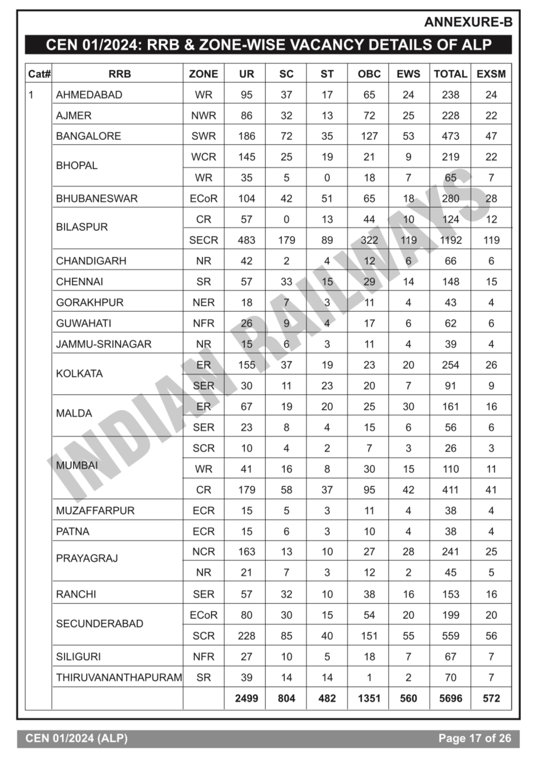 | RRB ALP Vacancy Details Total Post : 5696 |