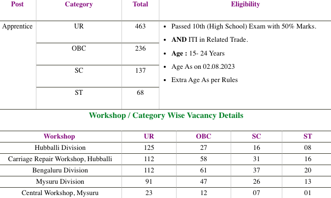 | RRC SWR Apprentice Vacancy Details Total Post : 904 | |||||||||