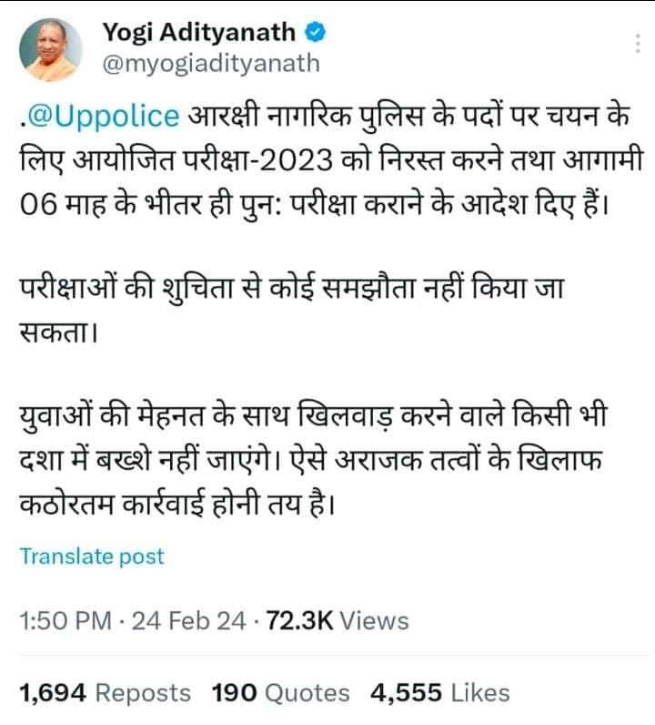 - योगी आदित्य नाथ के अनुसार :- आरक्षी नागरिक पुलिस के पदों पर चयन के लिए आयोजित परीक्षा-2023 को निरस्त करने तथा आगामी 06 माह के भीतर ही पुनः परीक्षा कराने के आदेश दिए हैं। परीक्षाओं की शुचिता से कोई समझौता नहीं किया जा सकता। युवाओं की मेहनत के साथ खिलवाड़ करने वाले किसी भी दशा में बख्शे नहीं जाएंगे। ऐसे अराजक तत्वों के खिलाफ कठोरतम कार्रवाई होनी तय है